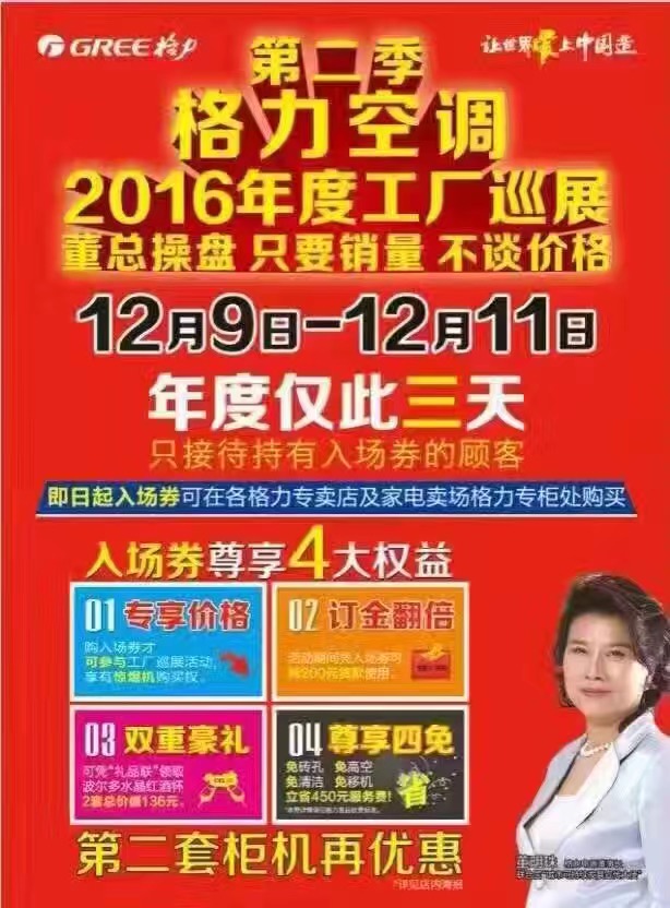 第二季格力空調(diào)2016年度工廠巡展即將開始,董總操盤,只要銷量,不談價格,價格絕對的火爆,十月一,雙十一,明年的萬人,統(tǒng)統(tǒng)都沒有這次的價格!信不信由你,但是不要后悔!因為活動之后價格馬上上漲,想買空調(diào)的親人們,一定不要錯過此次活動,力度空前。搶購熱線:2268088,地址:連山分局對面華商空調(diào)大廈。